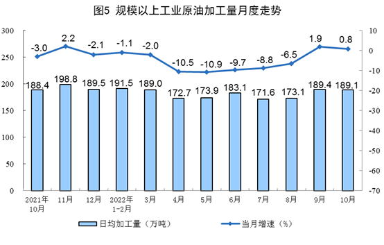 原油加工增速放缓。10月份,加工原油5862万吨,同比增长0.8%,增速比上月放缓1.1个百分点,日均加工189.1万吨。1—10月份,加工原油55588万吨,同比下降4.5%。
